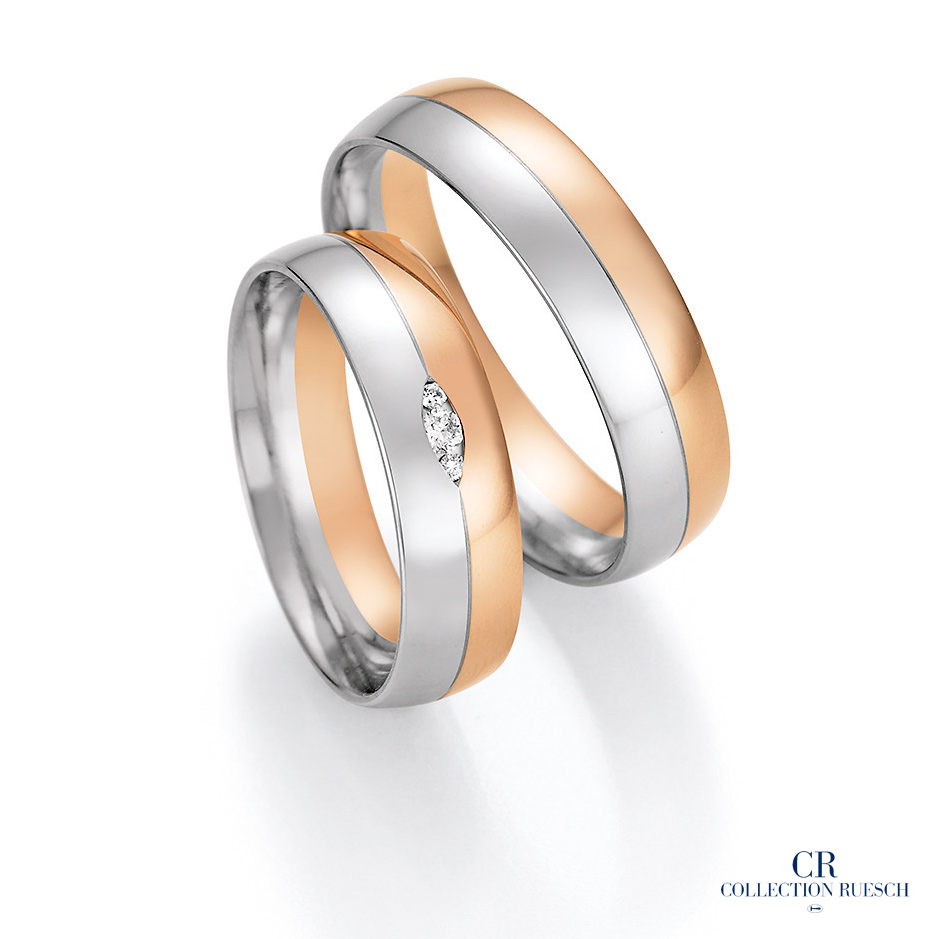 Ring links: Wit en roségoud 5,5 mm breed en heeft 0,045 karaat diamant.