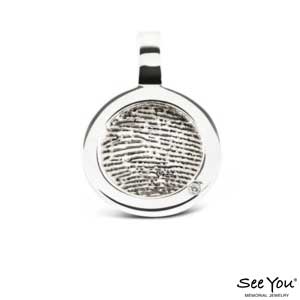 Zilveren hanger met vingerafdruk en zirkonia. De afmeting van de afdruk is afhankelijk van de grootte van de vingerafdruk. De afdruk kan indien gewenst kleiner gemaakt worden. De prijs is gebaseerd op de verwerking van een wasafdruk. Bij het aanleveren van een inktafdruk dient u rekening te houden met een meerprijs van €70,-.